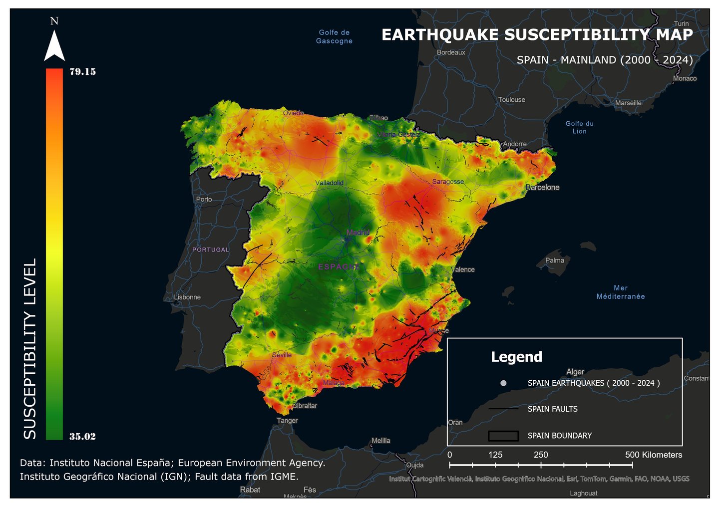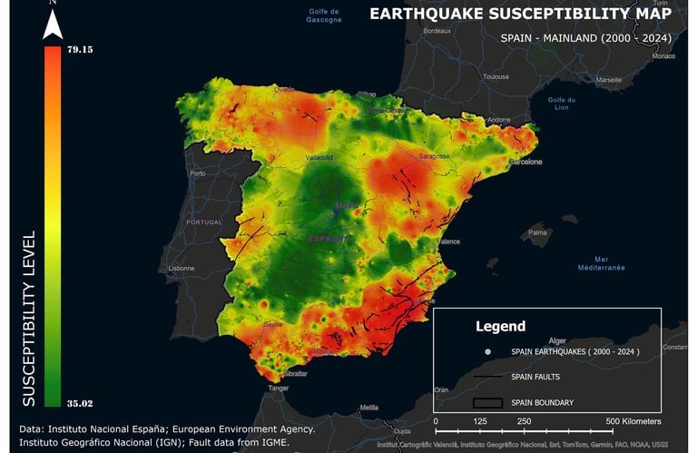 This map analyzes earthquake risk levels in Spain for the period from 2000 to 2024.